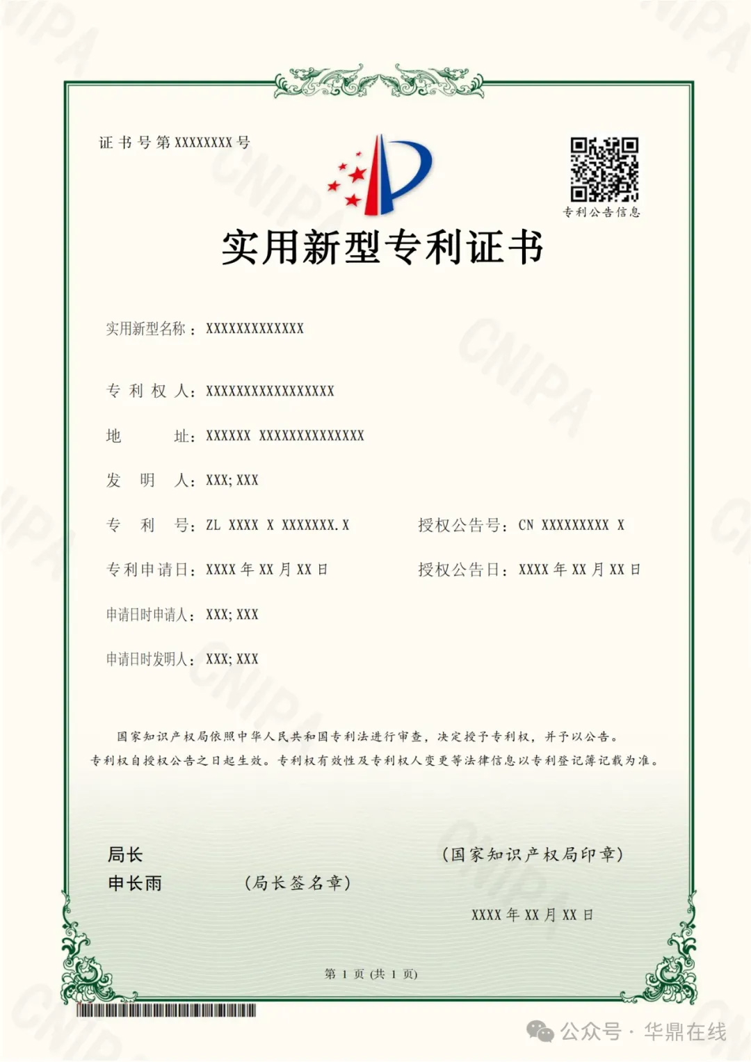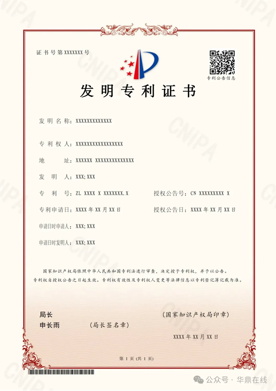 對(duì)于授權(quán)公告日在2024年6月1日之后(含當(dāng)日)的專利,國家知識(shí)產(chǎn)權(quán)局頒發(fā)新版專利證書。新版專利證書沿用A4規(guī)格豎排版式,優(yōu)化調(diào)整著錄事項(xiàng)布局。
