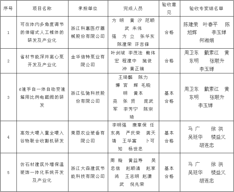 根據(jù)《金華市級科技計劃項目驗收管理辦法》(金市科字〔2015〕83號)規(guī)定,現(xiàn)將浙江科惠醫(yī)療器械股份有限公司、金華倍特泵業(yè)有限公司、浙江弘馳科技股份有限公司、萊恩農(nóng)業(yè)裝備有限公司、浙江大森建筑節(jié)能科技有限公司承擔的《可在體內(nèi)多角度調節(jié)的伸縮式人工椎體的研發(fā)及產(chǎn)業(yè)化》、《省材節(jié)能深井離心泵開發(fā)及產(chǎn)業(yè)化》、《6速手自一體自動變速箱用比例電磁閥的研發(fā)》、《高效大喂入量全喂入谷物聯(lián)合收割機研發(fā)》、《仿石材建筑外墻保溫裝飾一體化系統(tǒng)開發(fā)及產(chǎn)業(yè)化》5個市級科技計劃項目驗收結果予以公示,接受社會監(jiān)督,公示期從2017年9月26日至10月8日止。任何單位和個人對驗收意見持有異議的,應當在公示期內(nèi)書面向市科技局提出異議,單位應采用書面形式并加蓋公章,個人應采用實名提出異議。
