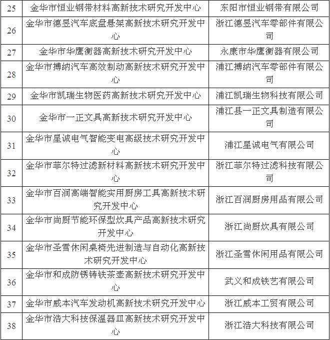 金華市級高新技術(shù)研究開發(fā)中心名單