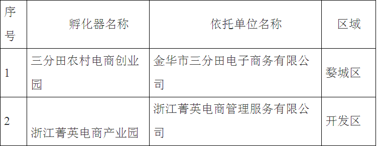 根據(jù)《金華市級(jí)科技孵化器認(rèn)定與管理辦法》(金市科字〔2010〕66號(hào)),擬認(rèn)定三分田農(nóng)村電商創(chuàng)業(yè)園、浙江菁英電商產(chǎn)業(yè)園2家單位為金華市級(jí)科技孵化器,現(xiàn)予以公示,接受社會(huì)監(jiān)督。如有異議,請(qǐng)來人來電反映,以個(gè)人名義反映的,請(qǐng)署真實(shí)姓名;以單位反映的,須加蓋單位公章;匿名反映的材料不予受理。公示日期為12月19日至12月26日。