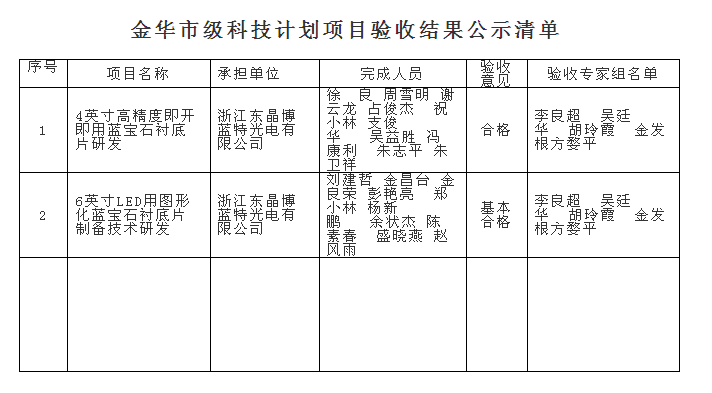 根據(jù)《金華市級(jí)科技計(jì)劃項(xiàng)目驗(yàn)收管理辦法》(金市科字〔2015〕83號(hào))規(guī)定,現(xiàn)將浙江東晶博藍(lán)特光電有限公司承擔(dān)的《4英寸高精度即開即用藍(lán)寶石襯底片研發(fā)》和《6英寸LED用圖形化藍(lán)寶石襯底片制備技術(shù)研發(fā)》2個(gè)市級(jí)科技計(jì)劃項(xiàng)目驗(yàn)收結(jié)果予以公示,接受社會(huì)監(jiān)督,公示期從2017年7月31日至8月6日止。任何單位和個(gè)人對(duì)驗(yàn)收意見(jiàn)持有異議的,應(yīng)當(dāng)在公示期內(nèi)書面向市科技局提出異議,單位應(yīng)采用書面形式并加蓋公章,個(gè)人應(yīng)采用實(shí)名提出異議。